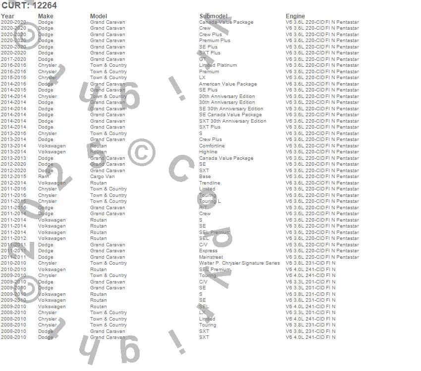 Below is an abbreviated list of applications for the Class II 1.25 in. Receiver Hitch.C/V, Grand Caravan, Routan, Town & Country, Chrysler, Dodge, Ram, Volkswagen, 2020, 2019, 2018, 2017, 2016, 2015, 2014, 2013, 2012, 2011, 2010, 2009