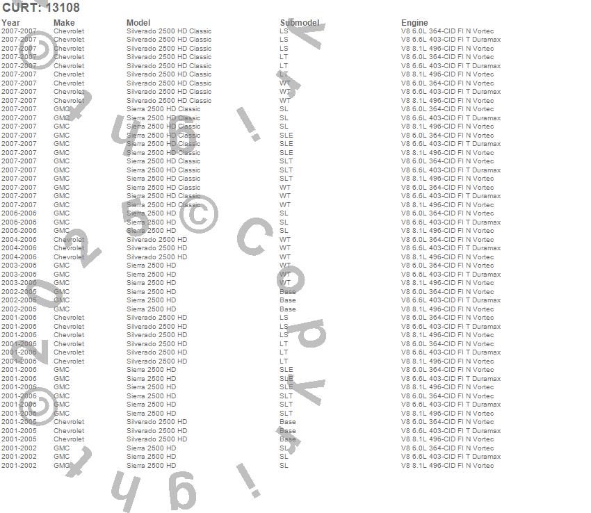 Below is an abbreviated list of applications for the Class III 2 in. Receiver Hitch.Sierra 2500 HD, Sierra 2500 HD Classic, Silverado 2500 HD, Silverado 2500 HD Classic, Chevrolet, GMC, 2007, 2006, 2005, 2004, 2003, 2002, 2001