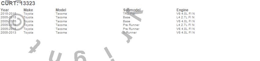 Brand: CURTPart Number: 13323Trailer Hitch Type: Rear - 5000lbs. Gross Trailer Weight - 500lbs. Tongue Weight - 5500lbs. Weight Distributing - 550lbs. Weight Distributing Tongue WeightUPC: 612314133239
