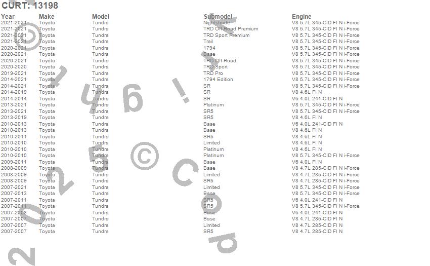 Below is an abbreviated list of applications for the Class III 2 in. Receiver Hitch.Tundra, Toyota, 2021, 2020, 2019, 2018, 2017, 2016, 2015, 2014, 2013, 2012, 2011, 2010, 2009, 2008, 2007