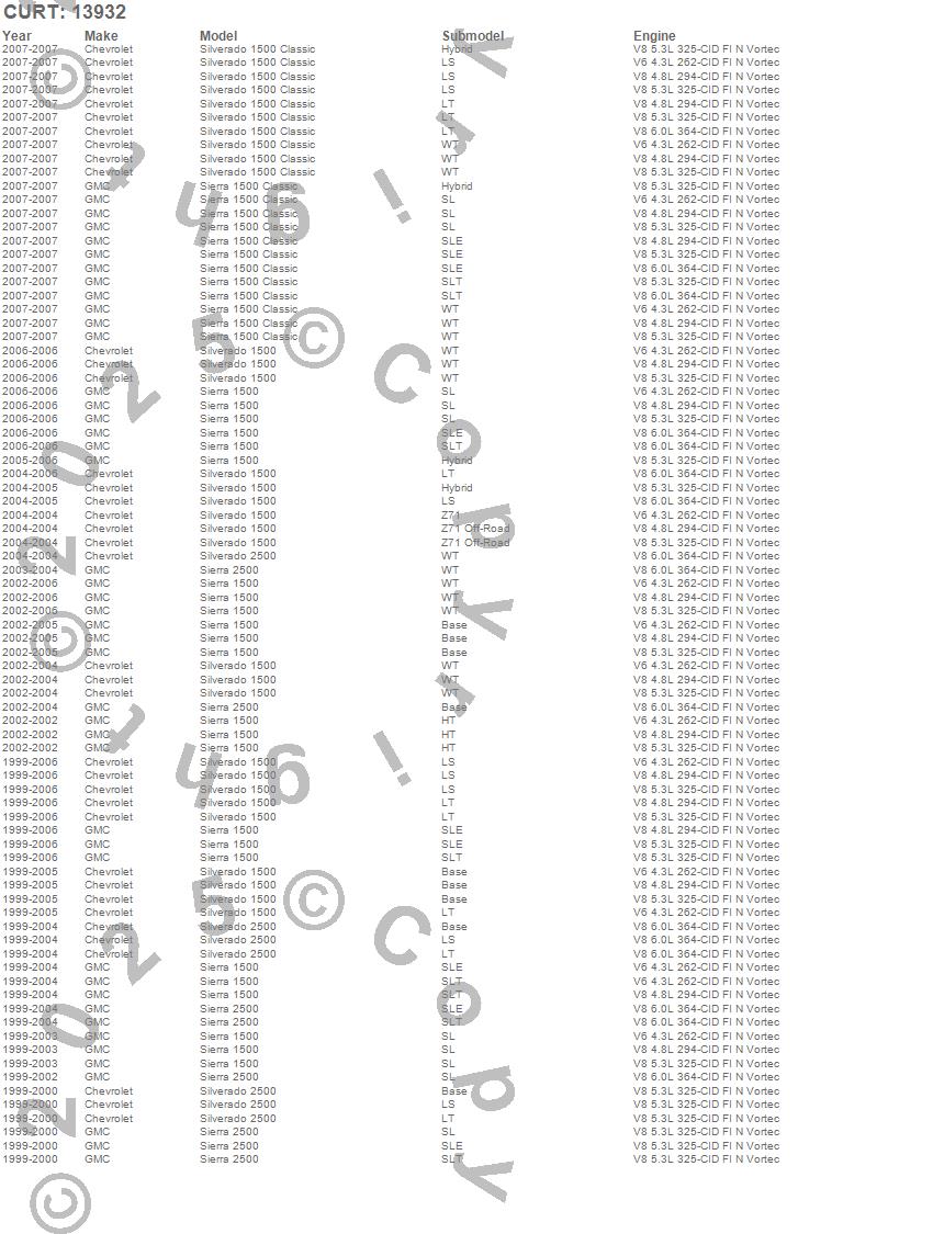 Brand: CURTPart Number: 13932Trailer Hitch Type: Rear - 5000lbs. Gross Trailer Weight - 500lbs. Tongue Weight - 8000lbs. Weight Distributing - 800lbs. Weight Distributing Tongue WeightUPC: 612314139323