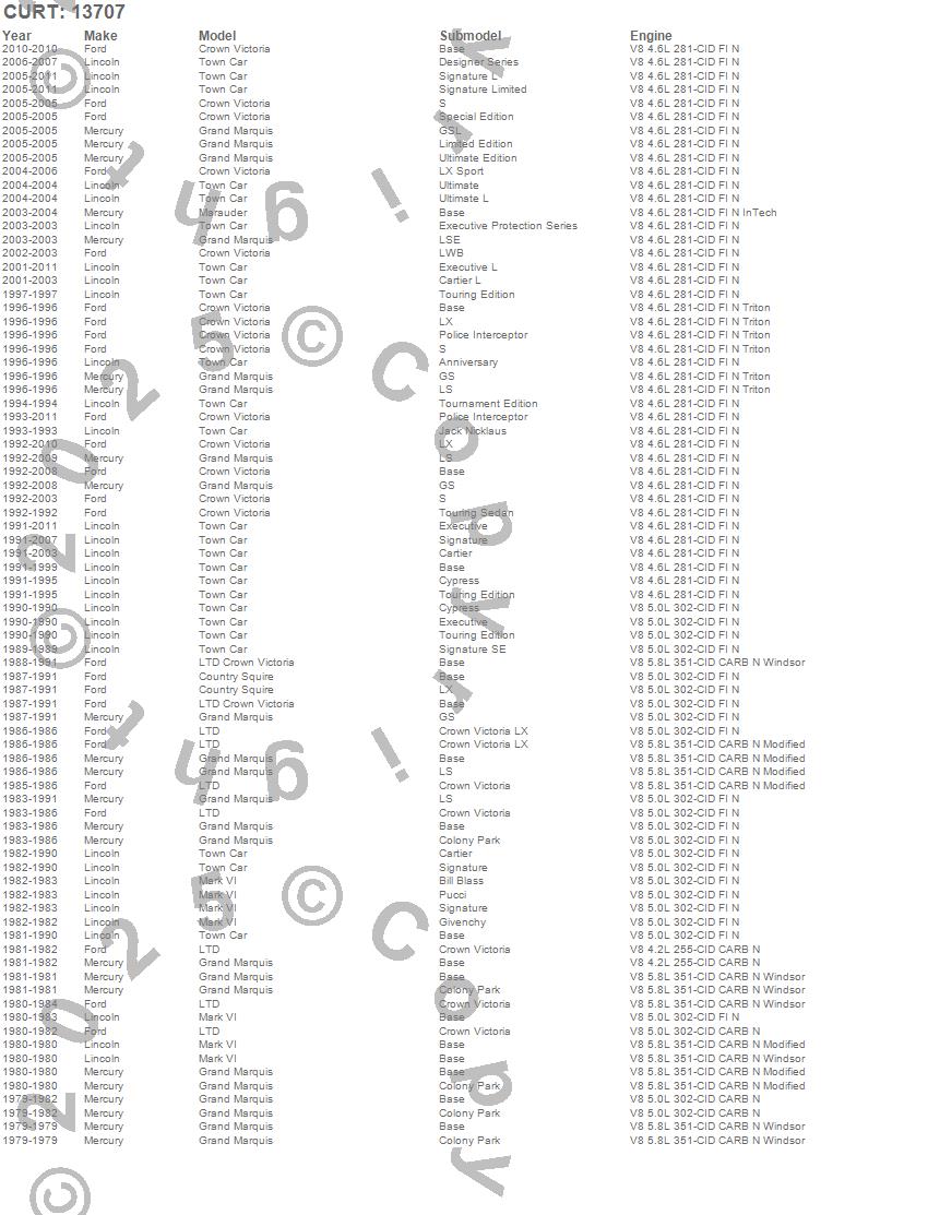 Below is an abbreviated list of applications for the Class III 2 in. Receiver Hitch.Country Squire, Crown Victoria, Grand Marquis, LTD, LTD Crown Victoria, Marauder, Mark VI, Town Car, Ford, Lincoln, Mercury, 2011, 2010, 2009, 2008, 2007, 2006, 2005, 2004, 2003