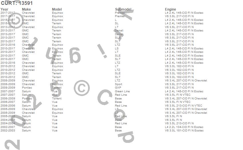 Below is an abbreviated list of applications for the Class III 2 in. Receiver Hitch.Equinox, Terrain, Torrent, Vue, Chevrolet, GMC, Pontiac, Saturn, 2017, 2016, 2015, 2014, 2013, 2012, 2011, 2010, 2009, 2008, 2007, 2006