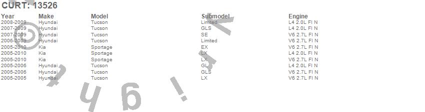 Below is an abbreviated list of applications for the Class III 2 in. Receiver Hitch.Sportage, Tucson, Hyundai, Kia, 2010, 2009, 2008, 2007, 2006, 2005