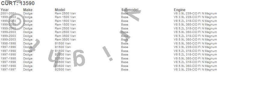 Brand: CURTPart Number: 13590Trailer Hitch Type: Rear - 5000lbs. Gross Trailer Weight - 500lbs. Tongue Weight - 8000lbs. Weight Distributing - 800lbs. Weight Distributing Tongue WeightUPC: 612314135905