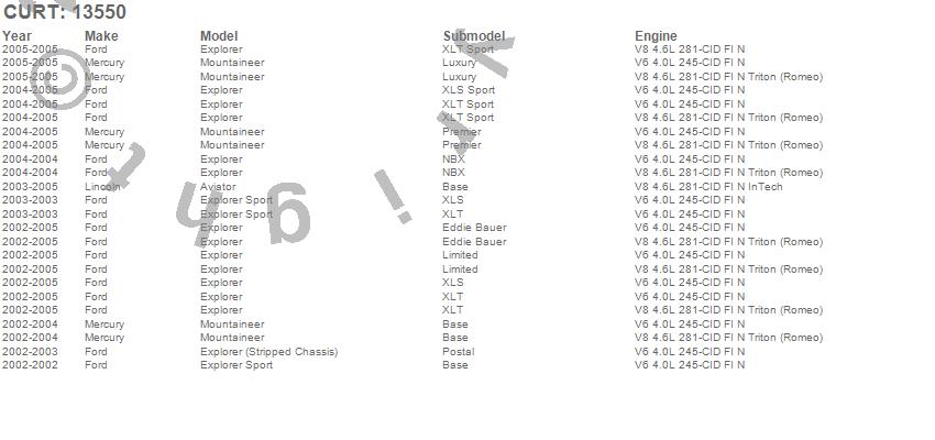 Below is an abbreviated list of applications for the Class III 2 in. Receiver Hitch.Aviator, Explorer, Explorer (Stripped Chassis), Explorer Sport, Mountaineer, Ford, Lincoln, Mercury, 2005, 2004, 2003, 2002