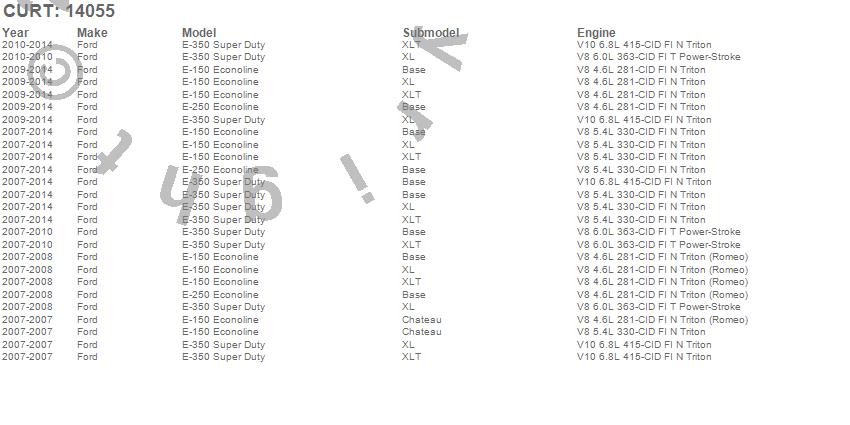 Below is an abbreviated list of applications for the Class IV 2 in. Receiver Hitch.E-150 Econoline, E-250 Econoline, E-350 Super Duty, Ford, 2014, 2013, 2012, 2011, 2010, 2009, 2008, 2007