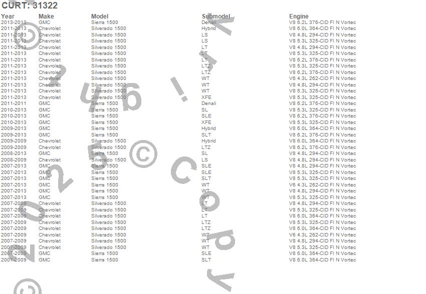 Below is an abbreviated list of applications for the 2 in. Receiver Hitch.Sierra 1500, Silverado 1500, Chevrolet, GMC, 2013, 2012, 2011, 2010, 2009, 2008, 2007