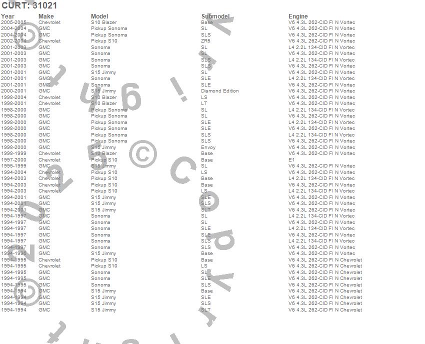 Below is an abbreviated list of applications for the 2 in. Receiver Hitch.S10 Blazer, S10 Pickup, S15 Jimmy, Sonoma, Chevrolet, GMC, 2005, 2004, 2003, 2002, 2001, 2000, 1999, 1998, 1997, 1996, 1995, 1994