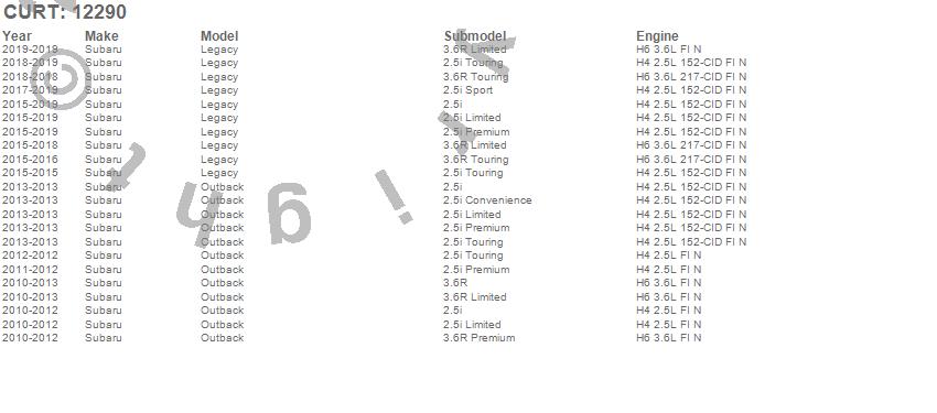 Below is an abbreviated list of applications for the Class II 1.25 in. Receiver Hitch.Legacy, Outback, Subaru, 2019, 2018, 2017, 2016, 2015, 2013, 2012, 2011, 2010