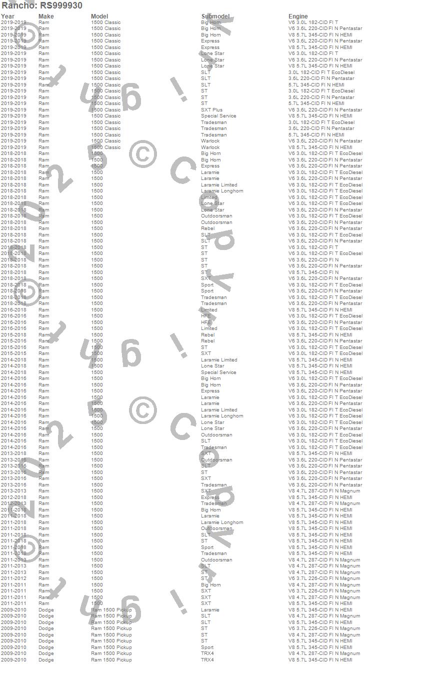 Brand: RanchoPart Number: RS999930Suspension Strut/Coil Spring Assembly Type: 1.75 in. Lift - Compatible With myRIDE Wireless ControllerUPC: 039703001663