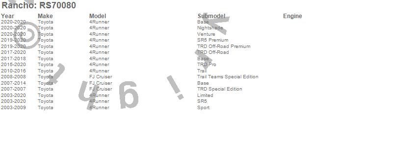 Below is an abbreviated list of applications for the QuickLIFT Coil Spring Spacer Kit.4RUNNER, FJ CRUISER, TOYOTA, 2012, 2011, 2010, 2009, 2008, 2007, 2006, 2005, 2004, 2003