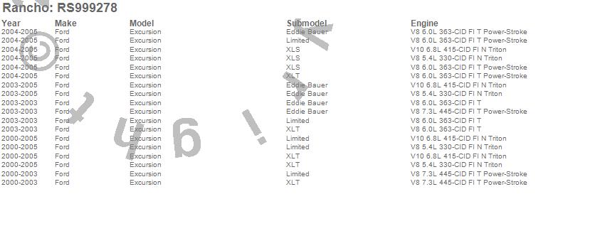 Below is an abbreviated list of applications for the Shock Absorber.EXCURSION, FORD, 2005, 2004, 2003, 2002, 2001, 2000