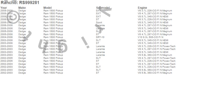 Below is an abbreviated list of applications for the Shock Absorber.RAM 1500 PICKUP, RAM 1500 PICKUP (Canadian), DODGE, 2008, 2007, 2006, 2005, 2004, 2003, 2002