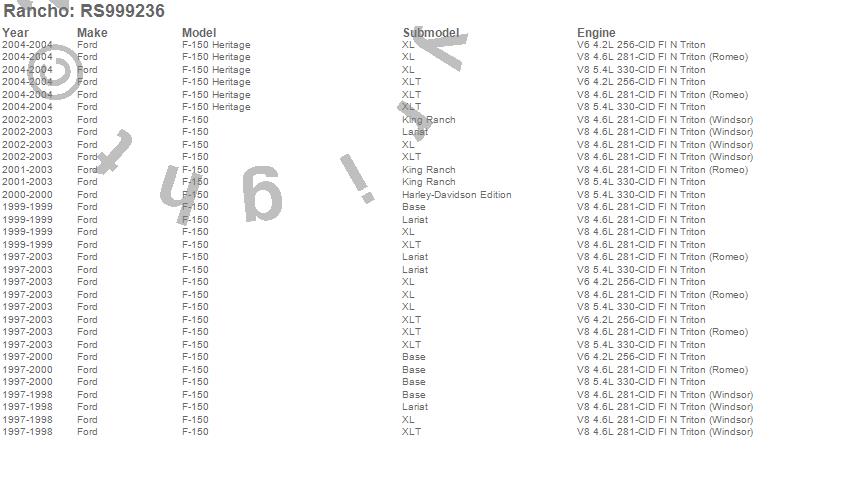 Below is an abbreviated list of applications for the Shock Absorber.F-150 HERITAGE PICKUP, F-150 PICKUP, FORD, 2004, 2003, 2002, 2001, 2000, 1999, 1998, 1997