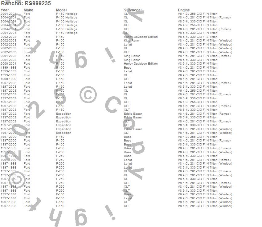 Below is an abbreviated list of applications for the Shock Absorber.EXPEDITION, F-150 HERITAGE PICKUP, F-150 PICKUP, F-250 PICKUP, FORD, 2004, 2003, 2002, 2001, 2000, 1999, 1998, 1997