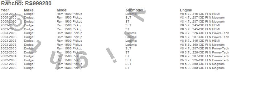 Below is an abbreviated list of applications for the Shock Absorber.RAM 1500 PICKUP, RAM 1500 PICKUP (Canadian), DODGE, 2005, 2004, 2003, 2002