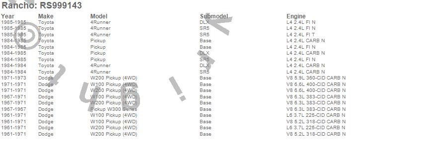 Below is an abbreviated list of applications for the Shock Absorber.4RUNNER, PICKUP, W100 PICKUP, W100 SERIES, W200 PICKUP, W300 SERIES, DODGE, TOYOTA, 1985, 1984, 1971, 1970, 1969, 1968, 1967, 1966, 1965, 1964, 1963, 1962