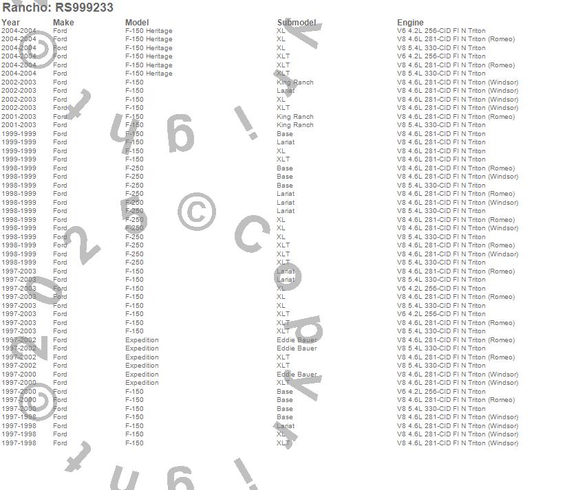 Below is an abbreviated list of applications for the Shock Absorber.EXPEDITION, F-150 HERITAGE PICKUP, F-150 PICKUP, F-250 PICKUP, FORD, 2004, 2003, 2002, 2001, 2000, 1999, 1998, 1997