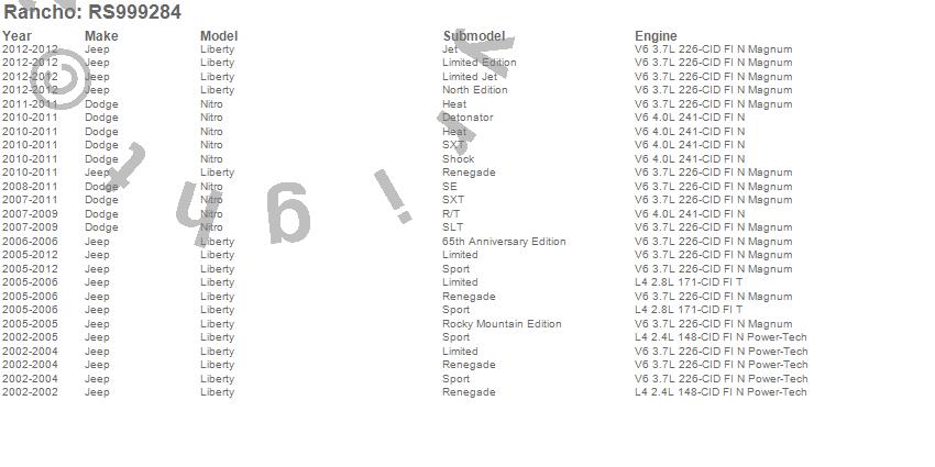 Below is an abbreviated list of applications for the Shock Absorber.LIBERTY (KJ), NITRO, NITRO (Canadian), YUKON XL 1500, DODGE, GMC, JEEP, 2011, 2010, 2009, 2008, 2007, 2006, 2005, 2004, 2003, 2002