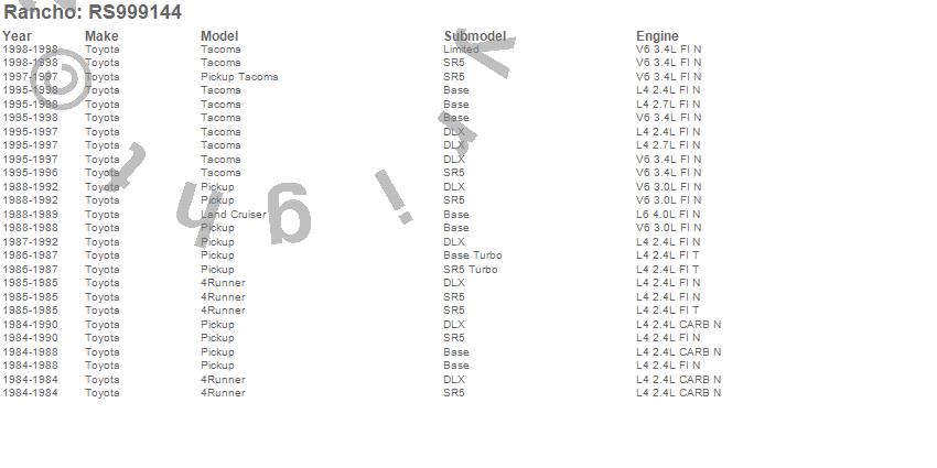 Below is an abbreviated list of applications for the Shock Absorber.4RUNNER, LAND CRUISER, PICKUP, TACOMA, TOYOTA, 1998, 1997, 1996, 1995, 1992, 1991, 1990, 1989, 1988, 1987, 1986, 1985, 1984