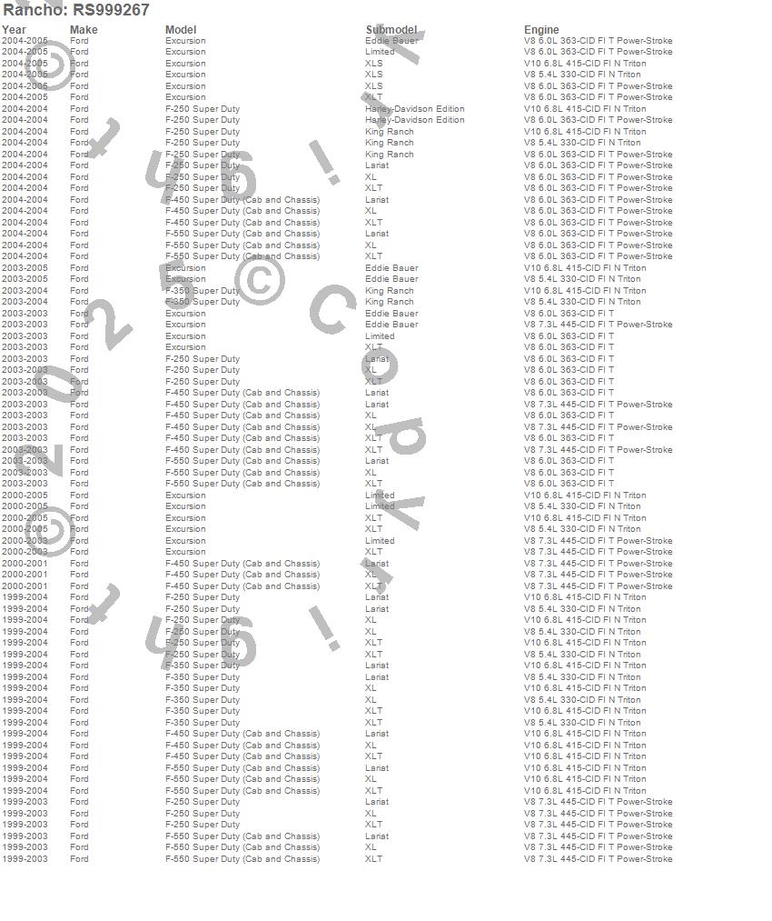 Below is an abbreviated list of applications for the Shock Absorber.EXCURSION, F-250 SUPER DUTY PICKUP, F-350 SUPER DUTY PICKUP, F-450 SUPER DUTY PICKUP, F-550 SUPER DUTY PICKUP, FORD, 2005, 2004, 2003, 2002, 2001, 2000, 1999