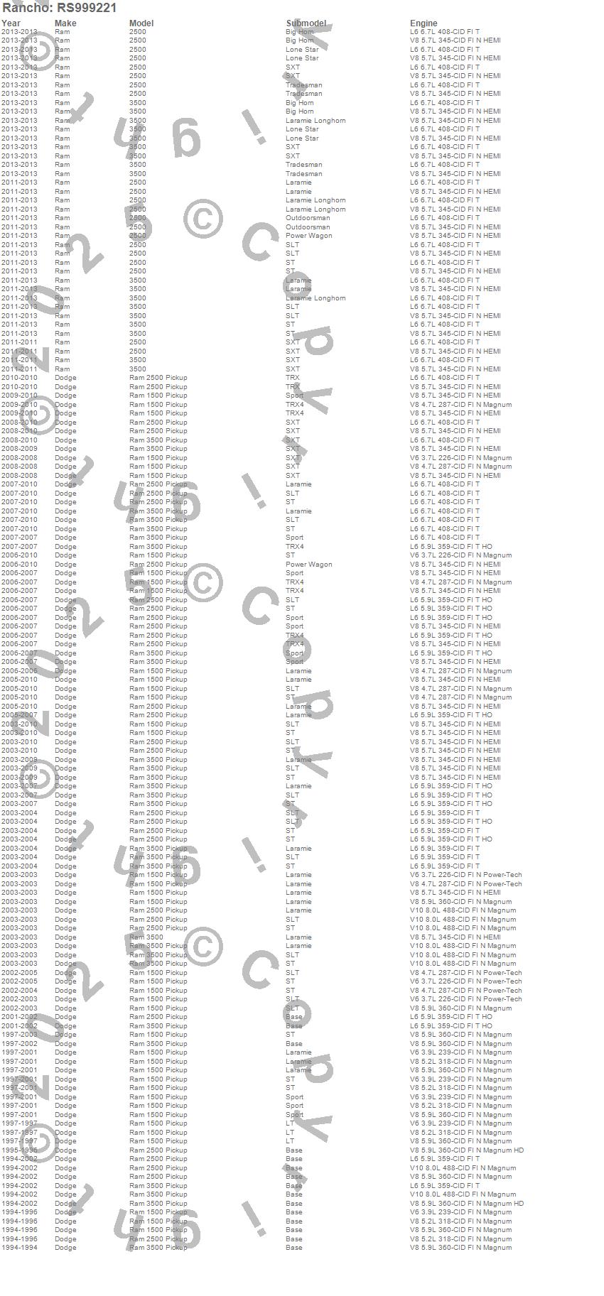 Below is an abbreviated list of applications for the Shock Absorber.2500, 2500 (Canadian), 3500, 3500 (Canadian), RAM 1500 PICKUP, RAM 2500 PICKUP, RAM 3500 PICKUP, RAM 3500 PICKUP (Canadian), DODGE, RAM, 2013, 2012, 2011, 2010, 2009, 2008, 2007, 2006, 2005, 2004