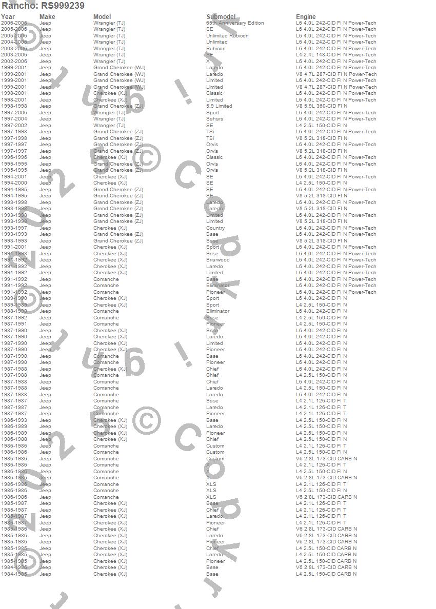 Below is an abbreviated list of applications for the Shock Absorber.CHEROKEE (XJ), COMANCHE, GRAND CHEROKEE (WJ), GRAND CHEROKEE (ZJ), TJ, WRANGLER, JEEP, 2006, 2005, 2004, 2003, 2002, 2001, 2000, 1999, 1998, 1997, 1996, 1995, 1994
