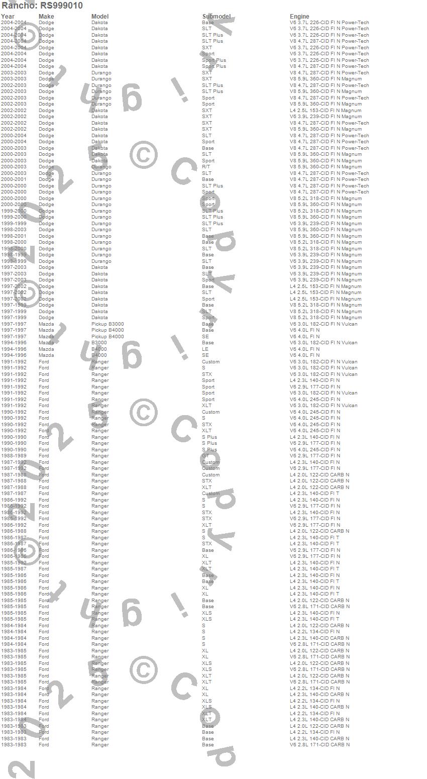 Below is an abbreviated list of applications for the Shock Absorber.B3000, B4000, DAKOTA, DURANGO, RANGER, DODGE, FORD, MAZDA, 2003, 2002, 2001, 2000, 1999, 1998, 1997, 1996, 1995, 1994, 1992, 1991