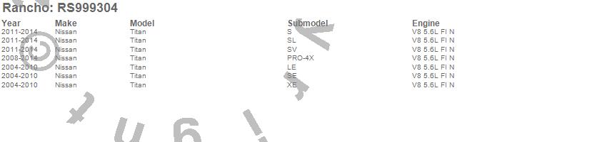 Below is an abbreviated list of applications for the Shock Absorber.TITAN, NISSAN, 2012, 2011, 2010, 2009, 2008, 2007, 2006, 2005, 2004