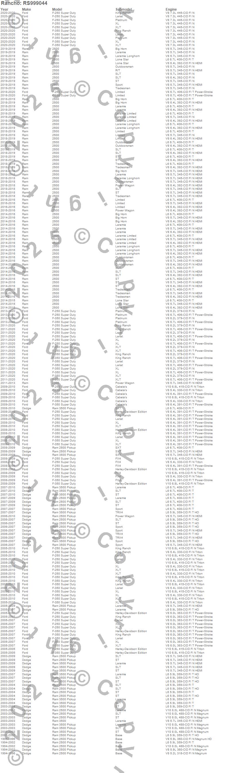 Below is an abbreviated list of applications for the Shock Absorber.F-250 SUPER DUTY PICKUP, F-250 SUPER DUTY PICKUP (Canadian), F-350 SUPER DUTY PICKUP, F-350 SUPER DUTY PICKUP (Canadian), RAM 2500 PICKUP, DODGE, FORD, 2013, 2012, 2011, 2010, 2009, 2008, 2007, 2006, 2005, 2004, 2003, 2002, 2001