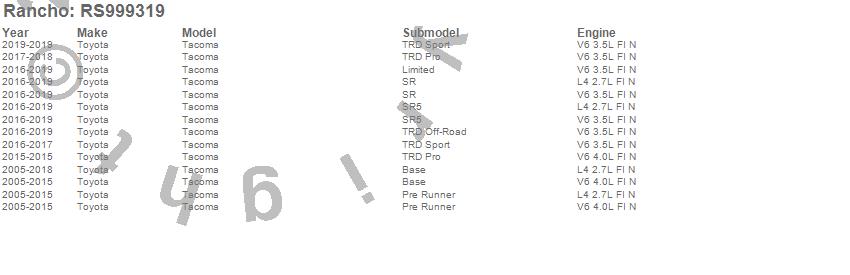 Below is an abbreviated list of applications for the Shock Absorber.TACOMA, TOYOTA, 2013, 2012, 2011, 2010, 2009, 2008, 2007, 2006, 2005