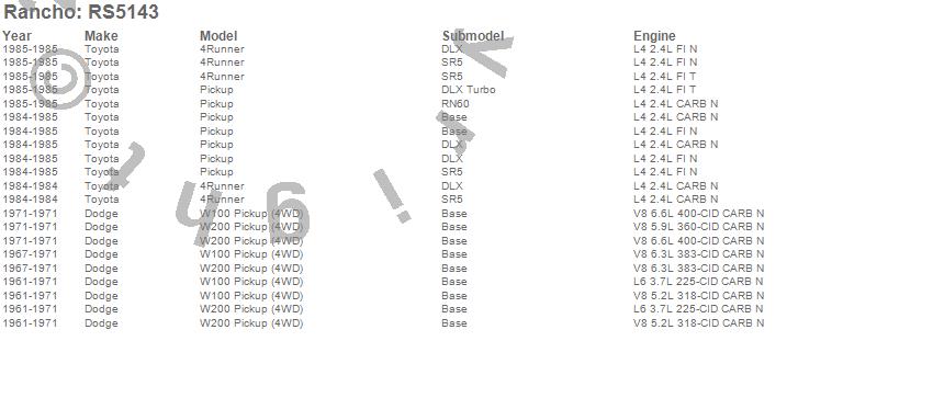 Below is an abbreviated list of applications for the Shock Absorber.4RUNNER, PICKUP, W100 PICKUP, W100 SERIES, W200 PICKUP, W300 SERIES, DODGE, TOYOTA, 1985, 1984, 1971, 1970, 1969, 1968, 1967, 1966, 1965, 1964, 1963, 1962