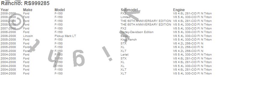 Below is an abbreviated list of applications for the Shock Absorber.F-150 PICKUP, MARK LT, FORD, LINCOLN, 2008, 2007, 2006, 2005, 2004