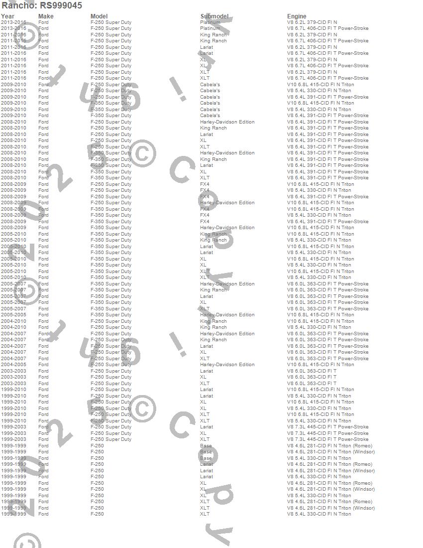 Below is an abbreviated list of applications for the Shock Absorber.F-250 SUPER DUTY PICKUP, F-250 SUPER DUTY PICKUP (Canadian), FORD, 2013, 2012, 2011, 2010, 2009, 2008, 2007, 2006, 2005, 2004, 2003, 2002, 2001, 2000, 1999