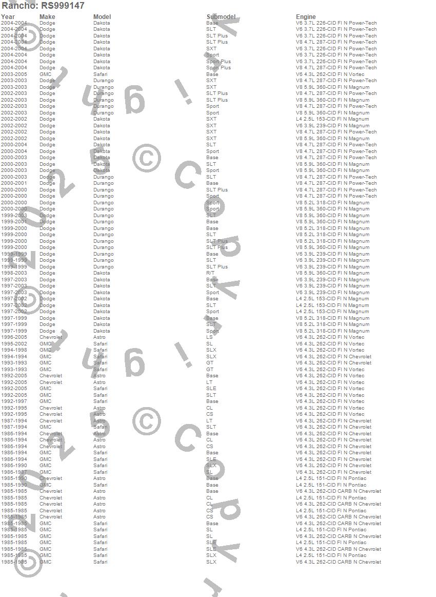 Below is an abbreviated list of applications for the Shock Absorber.ASTRO, DAKOTA, DURANGO, SAFARI, CHEVROLET, DODGE, GMC, 2005, 2004, 2003, 2002, 2001, 2000, 1999, 1998, 1997, 1996, 1995, 1994, 1993