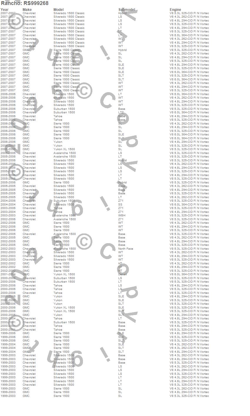 Below is an abbreviated list of applications for the Shock Absorber.AVALANCHE 1500, SIERRA 1500, SIERRA 1500 CLASSIC, SILVERADO 1500, SILVERADO 1500 CLASSIC, SUBURBAN 1500, TAHOE, YUKON, YUKON XL 1500, CHEVROLET, GMC, 2007, 2006, 2005, 2004, 2003, 2002, 2001, 2000, 1999