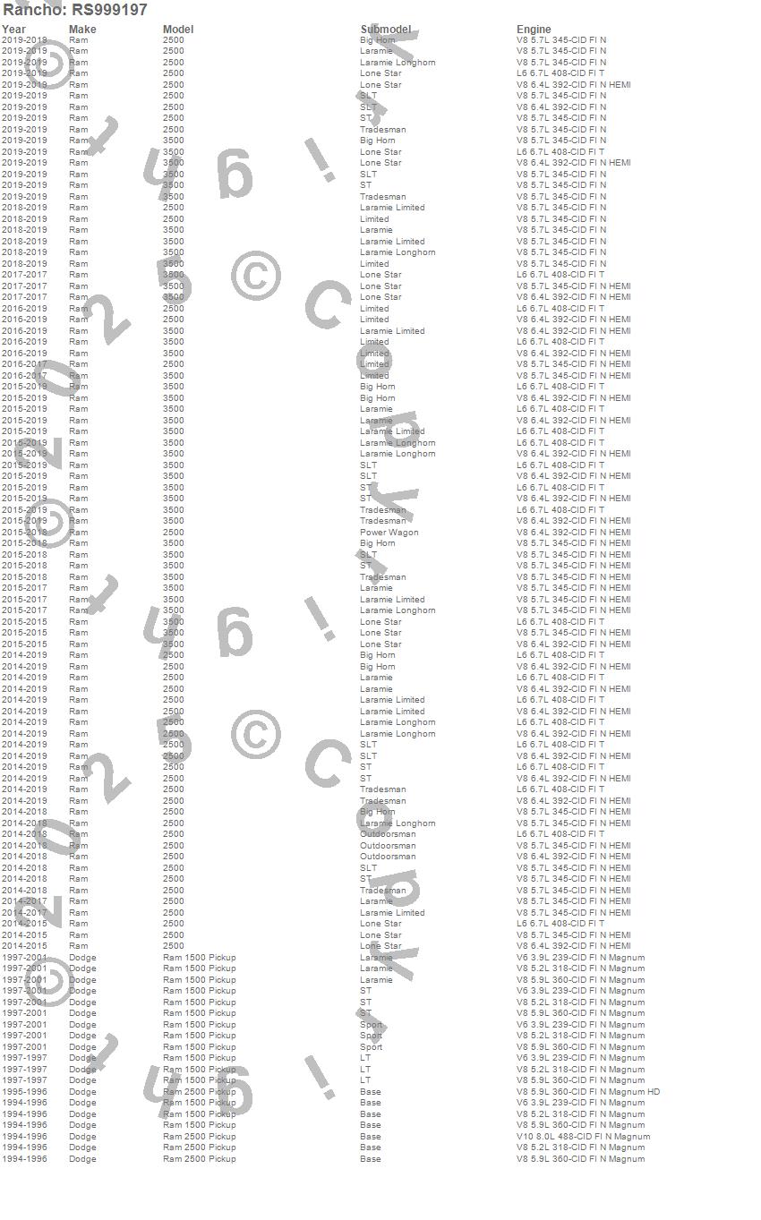 Below is an abbreviated list of applications for the Shock Absorber.RAM 1500 PICKUP, RAM 2500 PICKUP, DODGE, 2001, 2000, 1999, 1998, 1997, 1996, 1995, 1994