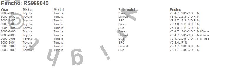 Below is an abbreviated list of applications for the Shock Absorber.TUNDRA, TOYOTA, 2006, 2005, 2004, 2003, 2002, 2001, 2000