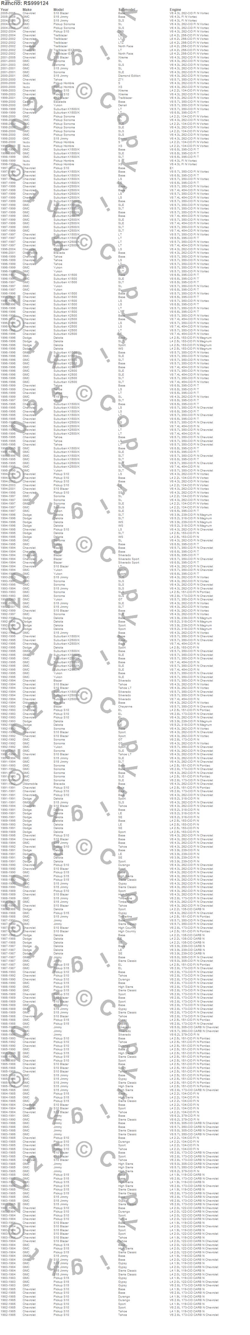 Below is an abbreviated list of applications for the Shock Absorber.BLAZER, BRAVADA, DAKOTA, ESCALADE, HOMBRE, JIMMY, K1500 SUBURBAN, K2500 SUBURBAN, S10 BLAZER, S10 PICKUP, S15 JIMMY, S15 PICKUP, SONOMA, TAHOE, YUKON, CADILLAC, CHEVROLET, DODGE, GMC, ISUZU
