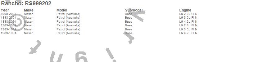 Below is an abbreviated list of applications for the Shock Absorber.PATROL (Australia), NISSAN, 2001, 2000, 1999, 1998, 1994, 1993, 1992, 1991, 1990, 1989