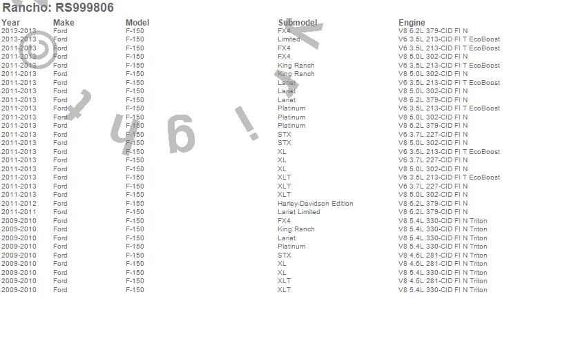 Below is an abbreviated list of applications for the RS9000XL Series Suspension Strut Assembly.F-150 PICKUP, FORD, 2013, 2012, 2011, 2010, 2009