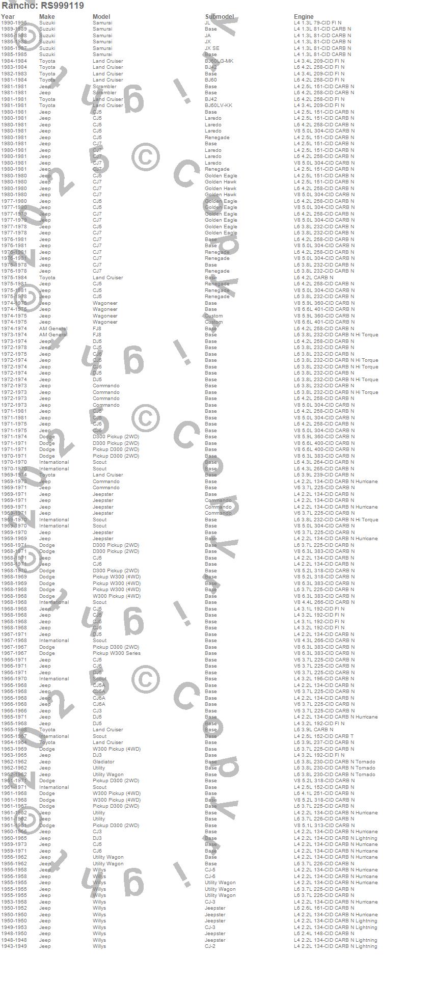 Below is an abbreviated list of applications for the Shock Absorber.CJ-2A, CJ-3A, CJ-3B, CJ5, CJ5 (Canadian), CJ6, CJ6 (Canadian), CJ7, D300 PICKUP, JEEPSTER, LAND CRUISER, M38, M38A1, MB, SAMURAI, SCOUT, SCRAMBLER, UTILITY, WAGONEER, WM300 PICKUP
