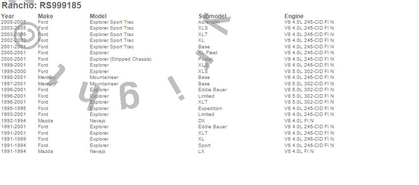 Below is an abbreviated list of applications for the Shock Absorber.EXPLORER, EXPLORER SPORT, EXPLORER SPORT TRAC, MOUNTAINEER, NAVAJO, FORD, MAZDA, MERCURY, 2005, 2004, 2003, 2002, 2001, 2000, 1999, 1998, 1997, 1996, 1995, 1994