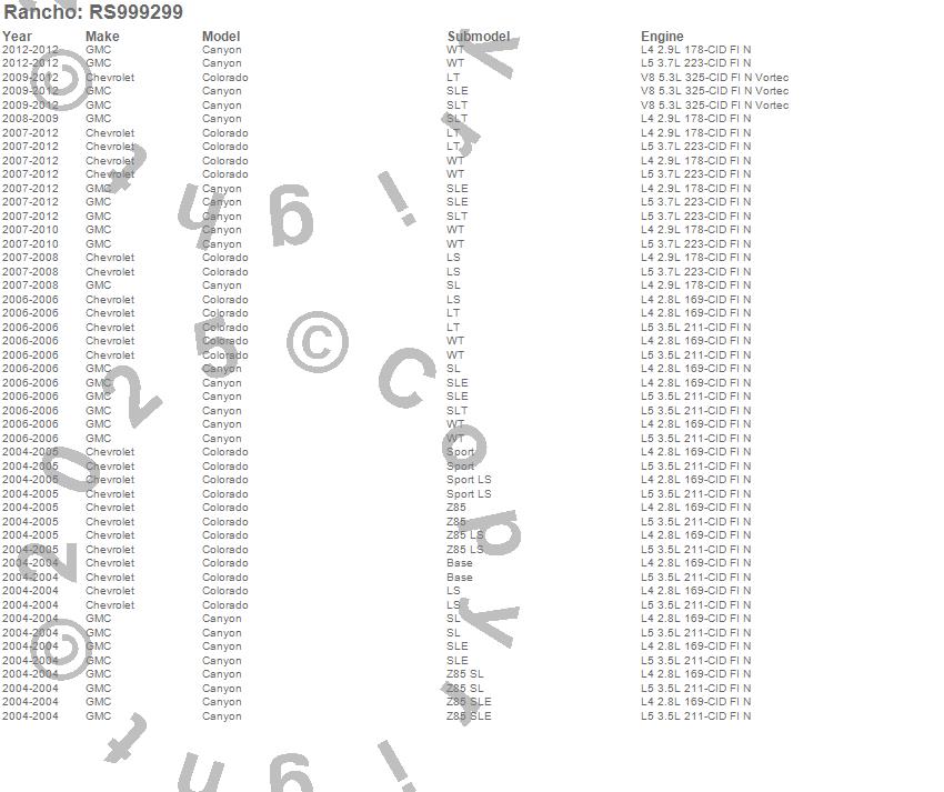 Below is an abbreviated list of applications for the Shock Absorber.CANYON, COLORADO, CHEVROLET, GMC, 2012, 2011, 2010, 2009, 2008, 2007, 2006, 2005, 2004