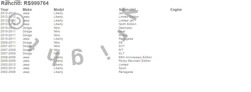 Below is an abbreviated list of applications for the RS Coil Over Shock Absorber.LIBERTY (KJ), NITRO, NITRO (Canadian), DODGE, JEEP, 2011, 2010, 2009, 2008, 2007, 2006, 2005, 2004, 2003, 2002