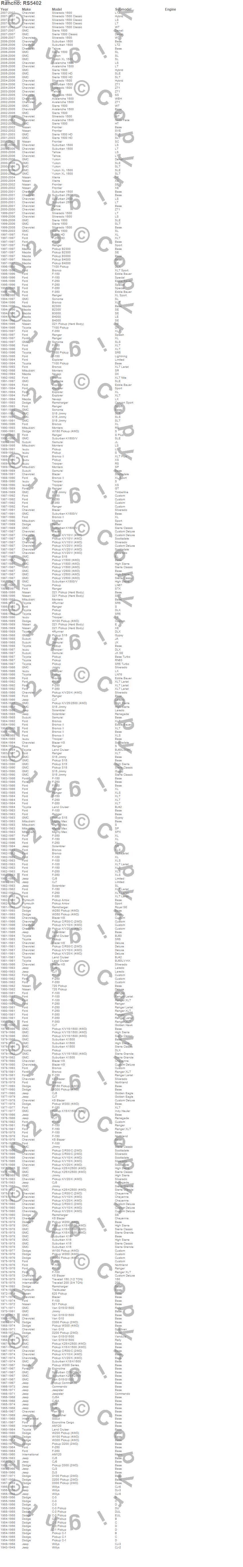 Below is an abbreviated list of applications for the RS5000 Steering Damper.4RUNNER, 521 PICKUP, 620 PICKUP, 720 PICKUP, ARROW PICKUP, AVALANCHE 1500, B2300, B3000, B4000, BLAZER, BLAZER K5, BRONCO, BRONCO II, C10 PICKUP, C10 PICKUP (Canadian), C10 SUBURBAN, C15 PICKUP, C15 SUBURBAN, C15/C1500 PICKUP, C15/C1500 SUBURBAN