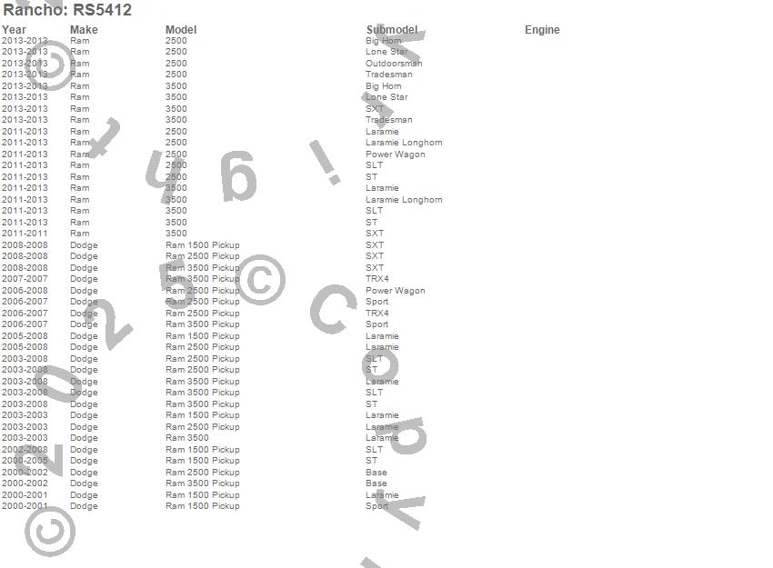 Below is an abbreviated list of applications for the RS5000 Steering Damper.2500, 3500, 3500 (Canadian), RAM 1500 PICKUP, RAM 1500 PICKUP (Canadian), RAM 2500 PICKUP, RAM 3500 PICKUP, DODGE, RAM, 2013, 2012, 2011, 2008, 2007, 2006, 2005, 2004, 2003, 2002, 2001