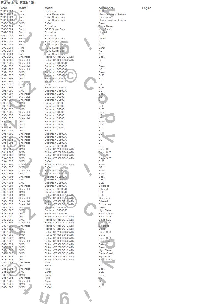 Below is an abbreviated list of applications for the RS5000 Steering Damper.ASTRO, C1500 SUBURBAN, C2500 PICKUP, C2500 SUBURBAN, C3500 PICKUP, EXCURSION, F-250 SUPER DUTY PICKUP, F-350 SUPER DUTY PICKUP, R2500 PICKUP, R3500 PICKUP, SAFARI, CHEVROLET, FORD, GMC, 2005, 2004, 2003, 2002, 2001, 2000