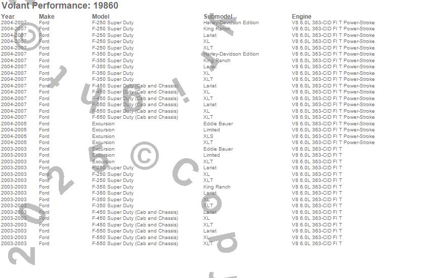 Below is an abbreviated list of applications for the Cold Air Intake Kit.Excursion, F-250 Super Duty, F-350 Super Duty, F-450 Super Duty, F-550 Super Duty, Ford, 2007, 2006, 2005, 2004, 2003